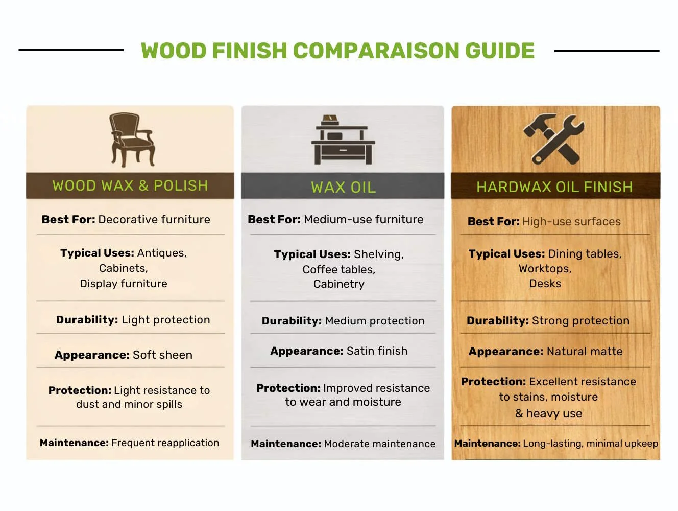 However, wax finishes generally offer lighter protection than oils, meaning they may need to be reapplied periodically to maintain their appearance.