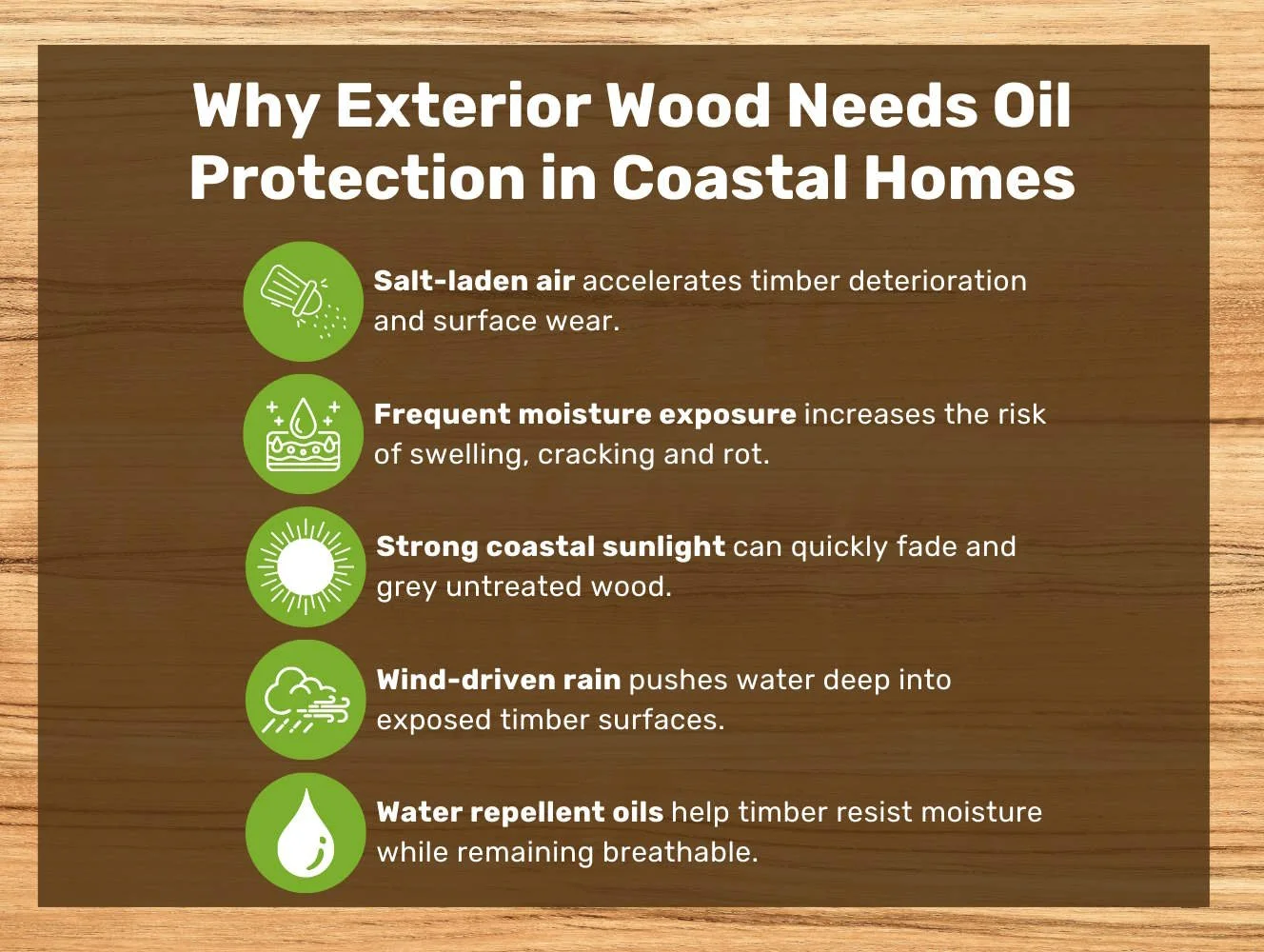Exterior timber in coastal locations faces several environmental pressures at once. Moisture is one of the most significant threats. Sea air carries high levels of humidity and salt, which can penetrate untreated wood and cause swelling, cracking and long-term structural damage.